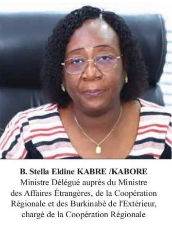 Ministre Délégué auprès du Ministre des Affaires Étrangères, de la Coopération Régionale et des Burkinabè de l’Extérieur, chargé de Coopération Régionale : Madame Bebgnasgnan Stella Eldine KABRE/KABORE