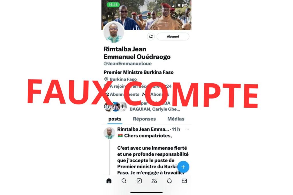 La DCRP tient à préciser que le Premier ministre Rimtalba Jean Emmanuel Ouédraogo ne possède aucun compte officiel sur le réseau social X (anciennement Twitter). « Toutes les publications, déclarations ou informations provenant de ce compte sont fausses et n’engagent en rien ni le Premier ministre ni le Gouvernement », indique le communiqué.