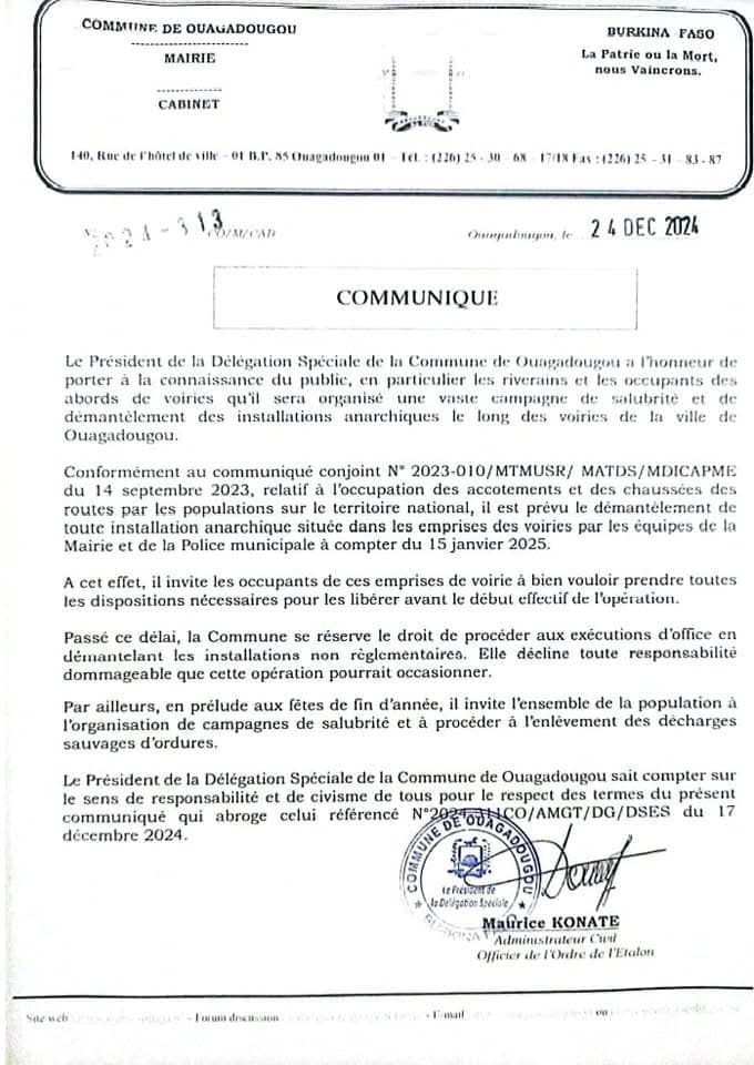 Ouagadougou : Une campagne de démantèlement des installations anarchiques à partir du 15 janvier 2025 (Communiqué)