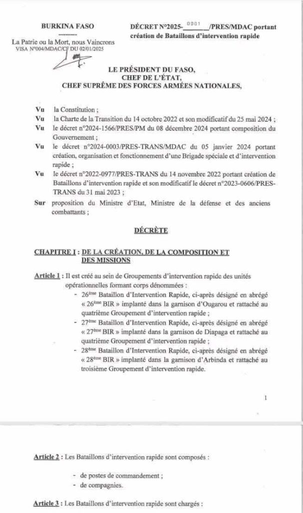 Le président du Faso, le Capitaine Ibrahim Traoré, a créé, jeudi trois nouveaux Bataillons d’intervention rapide (BIR) afin de renforcer les capacités opérationnelles des forces armées nationales du Burkina. Ces unités sont respectivement basées à Ougarou, Diapaga et Arbinda.