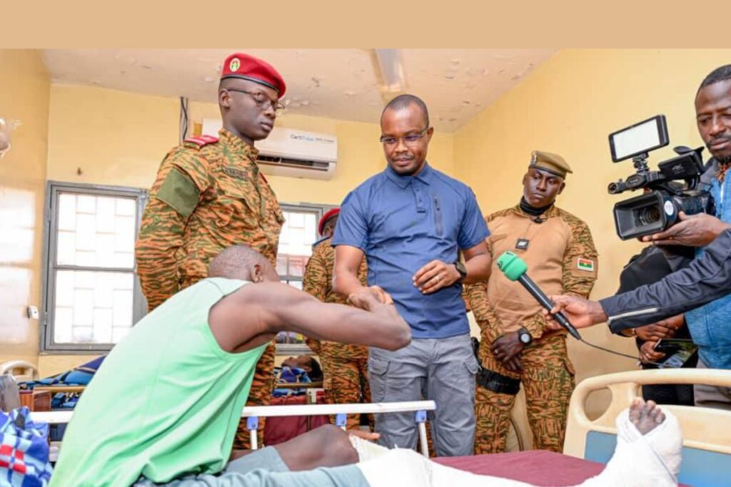 Poursuivant sa tournée, le Premier ministre s’est rendu à l’hôpital Capitaine Halassane Coulibaly, qui reçoit les blessés lors des opérations de sécurisation du territoire. Dans cet établissement, portant le nom d’un officier de santé des armées tombé à Djibo, il a apporté réconfort et reconnaissance aux blessés et au personnel soignant. « Le Burkina Faso est debout grâce à votre sacrifice, et nous triompherons. Gardez le moral, car la victoire est proche », a-t-il déclaré aux combattants blessés.