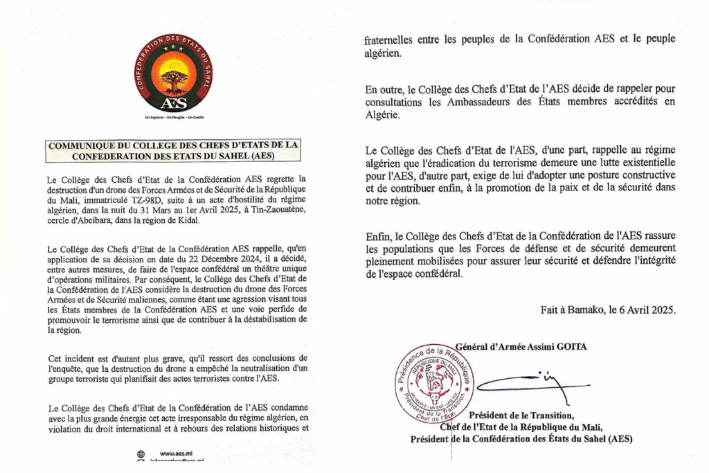 Le Collège des Chefs d’État de l’AES a condamné, dimanche, la destruction par l’Algérie d’un drone militaire malien (T2-98D) survenue dans la nuit du 31 mars au 1er avril 2025 à Tin-Zaouatene (région de Kidal). Selon le Collège des Chefs d’État de l’AES, il s’agit d’un acte « hostile », en violation du droit international et des relations « historiques » entre les peuples de l’AES et l’Algérie.
