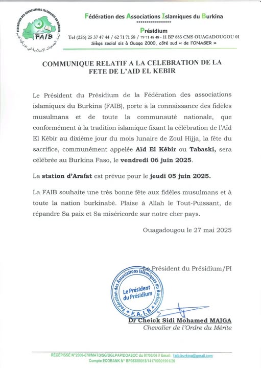 La fête de l’Aïd El Kébã communément appelée Tabaski sera célébrée au Burkina Faso le vendredi 6 juin 2025. L’annonce a été faite mardi par la Fédération des associations islamiques du Burkina (FAIB).