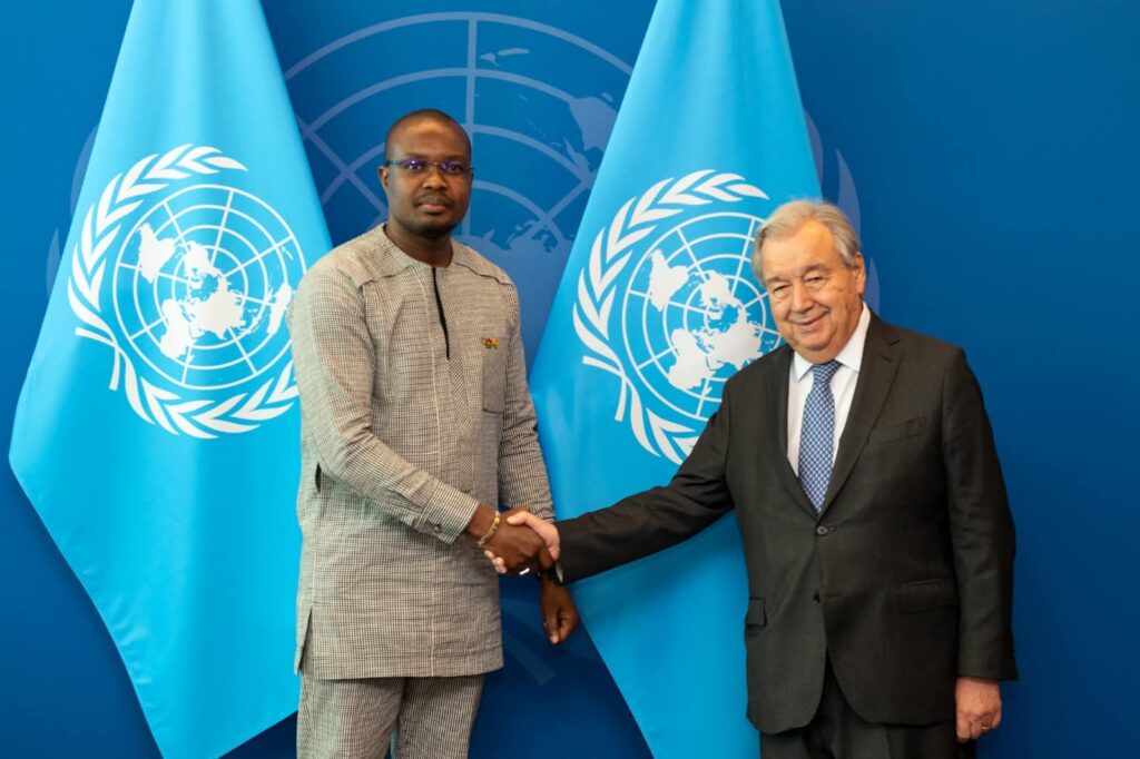 Le Premier ministre, Chef du Gouvernement, Rimtalba Jean Emmanuel Ouédraogo, a eu un entretien, dans la soirée du samedi 27 septembre 2025, avec le Secrétaire général de l’ONU, M. António Guterres. Cette rencontre, qui est intervenue après la déclaration à la tribune de l’Assemblée générale des Nations unies, a été pour le Chef du Gouvernement burkinabè une tribune privilégiée pour soutenir et préciser la position du pays sur les défis actuels.