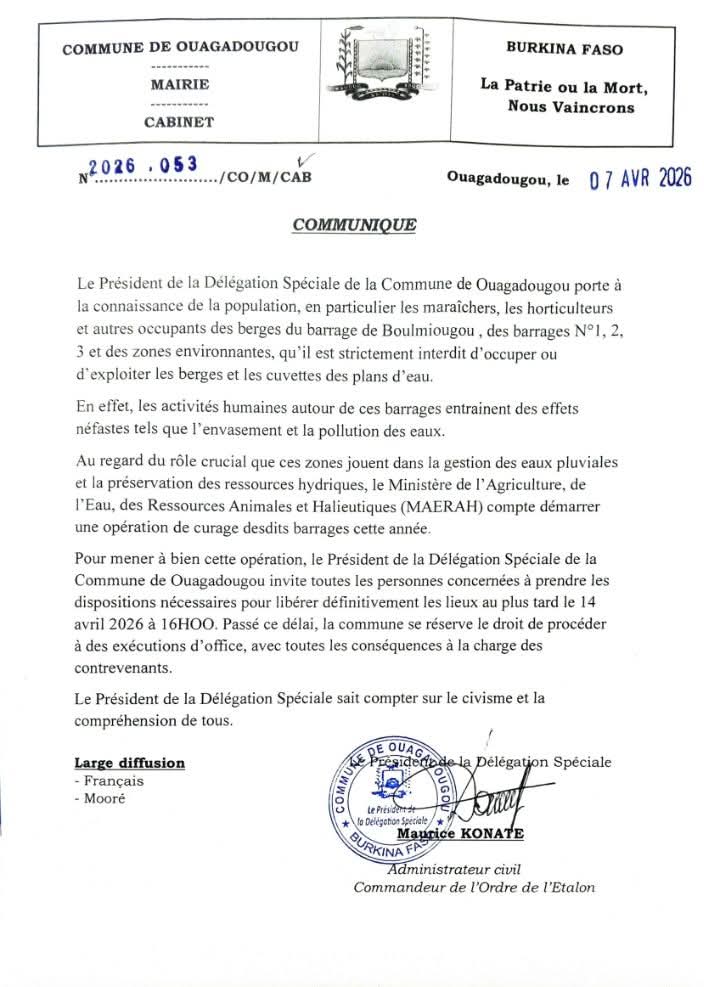Dans un communiqué signé le 7 avril 2026, le président de la Délégation spéciale de la commune de Ouagadougou interdit aux maraîchers, horticulteurs, etc., l’occupation et l’exploitation des berges des barrages de Boulmiougou ainsi que des barrages n°1, 2 et 3.